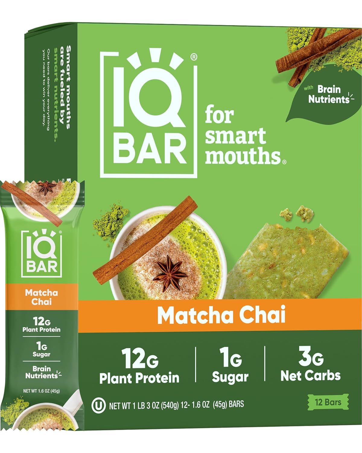 IQBAR Brain and Body Plant Protein Bars - Matcha Chai - 12-Count Low Carb - Gluten Free, High Fiber, Vegan Snacks - Low Sugar